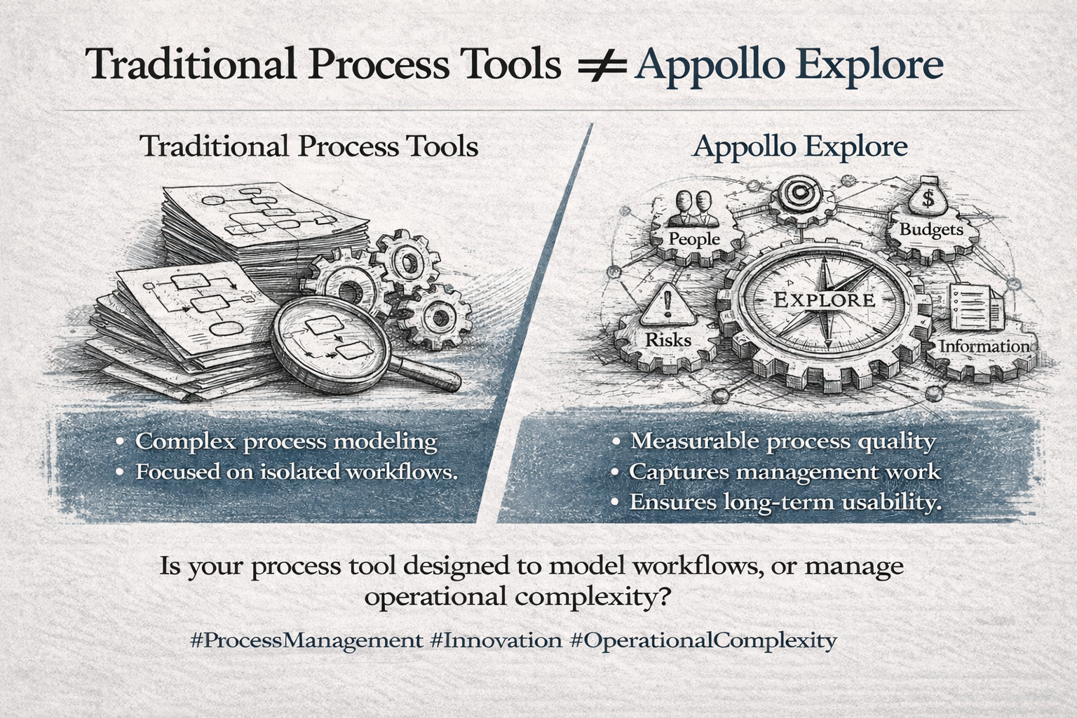 Appollo Explore takes a fundamentally different approach. It begins with the complexity of process management in context—how processes interact with people, goals, risks, information, and budgets across the organization.
